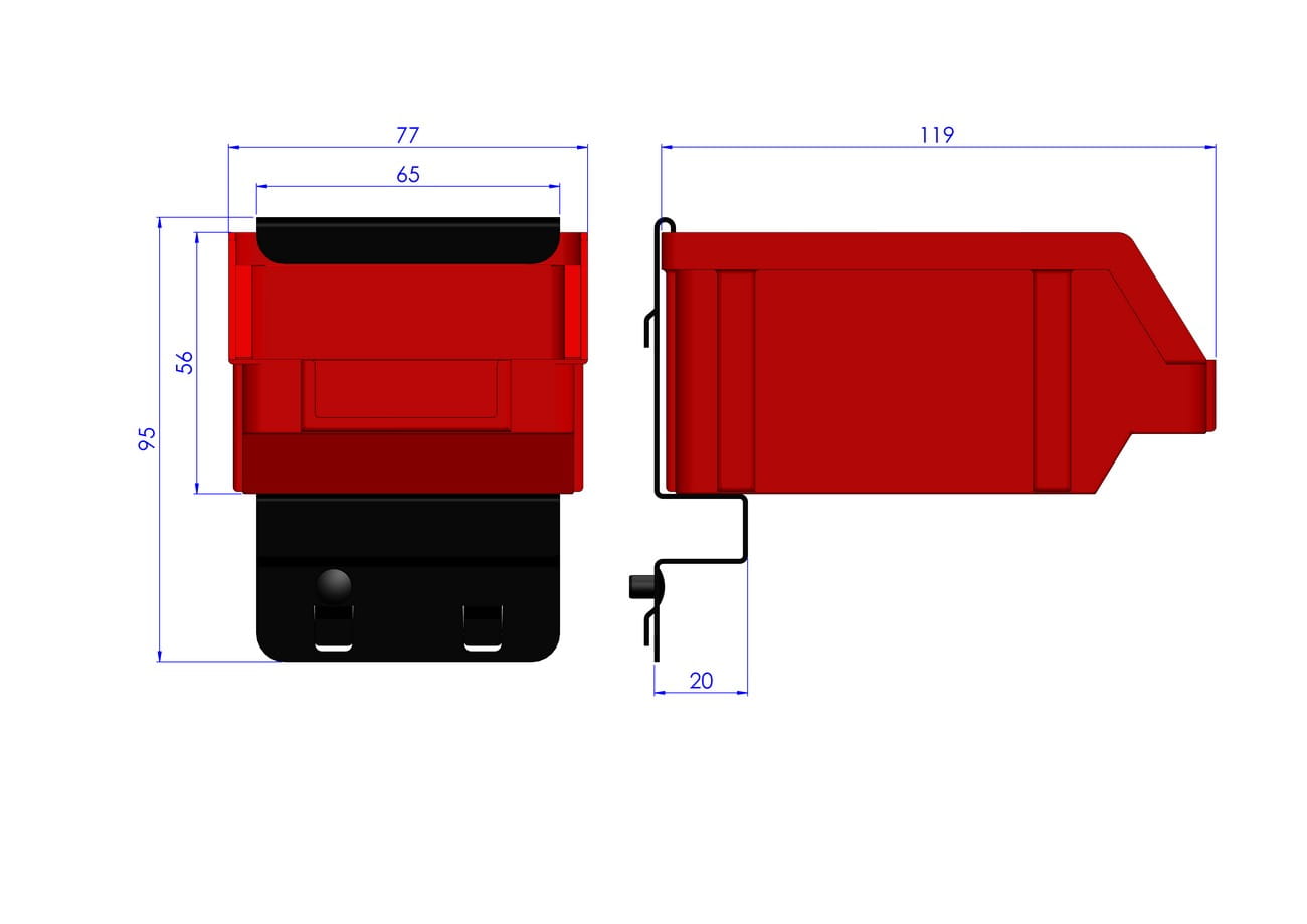 - przystosowana do zawieszenia 1 pojemnika P1 o wymiarach: szerokość 77 mm, głębokość 119 mm, wysokość 56 mm