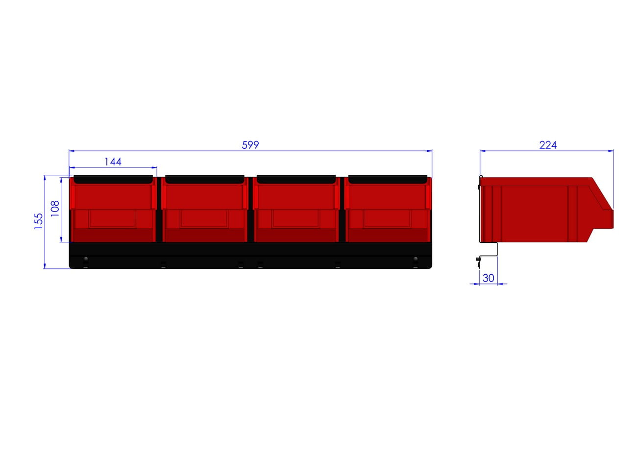 - przystosowana do zawieszenia 4 pojemników P3 o wymiarach: szerokość 144 mm, głębokość 224 mm, wysokość 108 mm