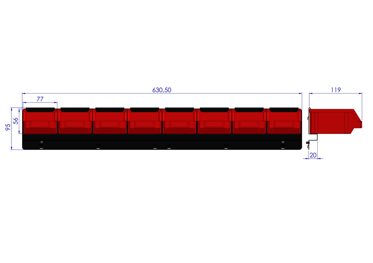 - przystosowana do zawieszenia 8 pojemników P1 o wymiarach: szerokość 77 mm, głębokość 119 mm, wysokość 56 mm