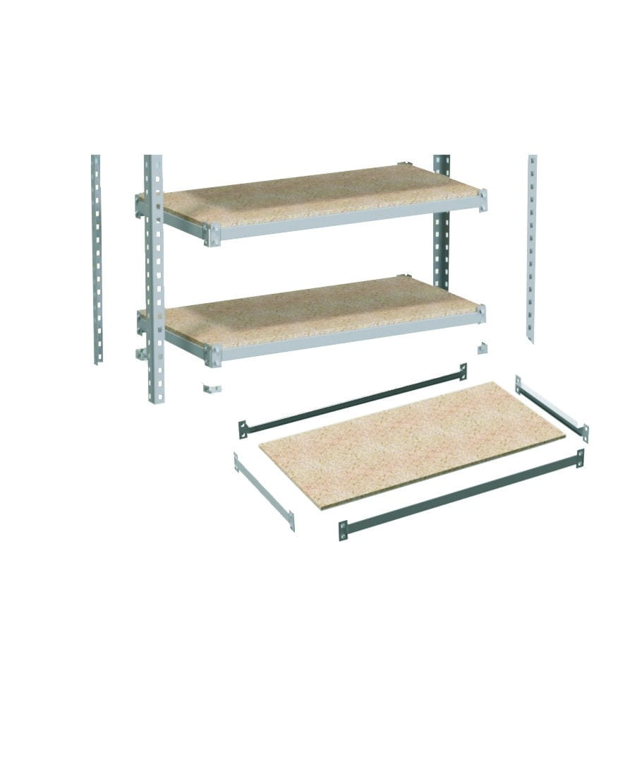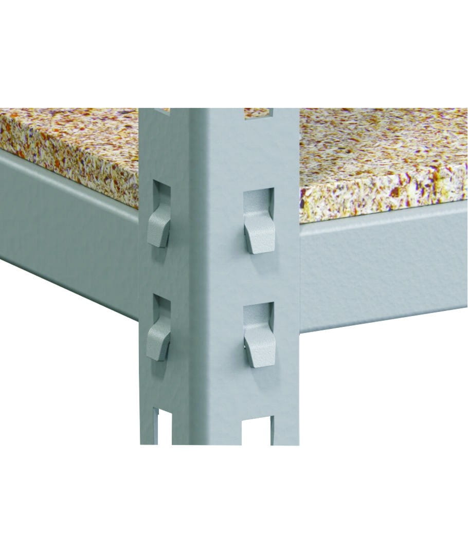 - Dzięki zastosowaniu specjalnych zaczepów montażowych do połączenia poprzeczki z nogą regału uzyskaliśmy znacznie większe obciążenie statyczne półki do 290 kg