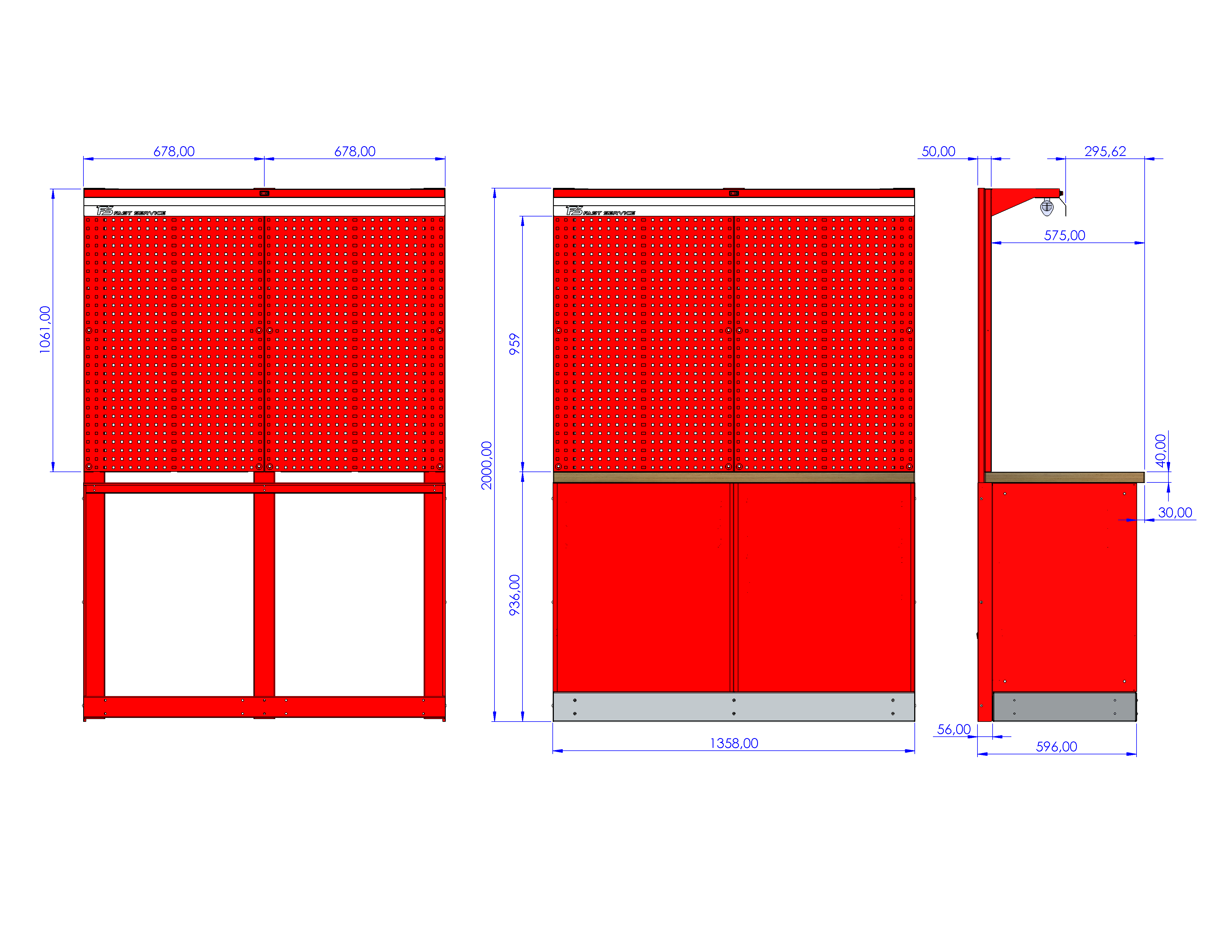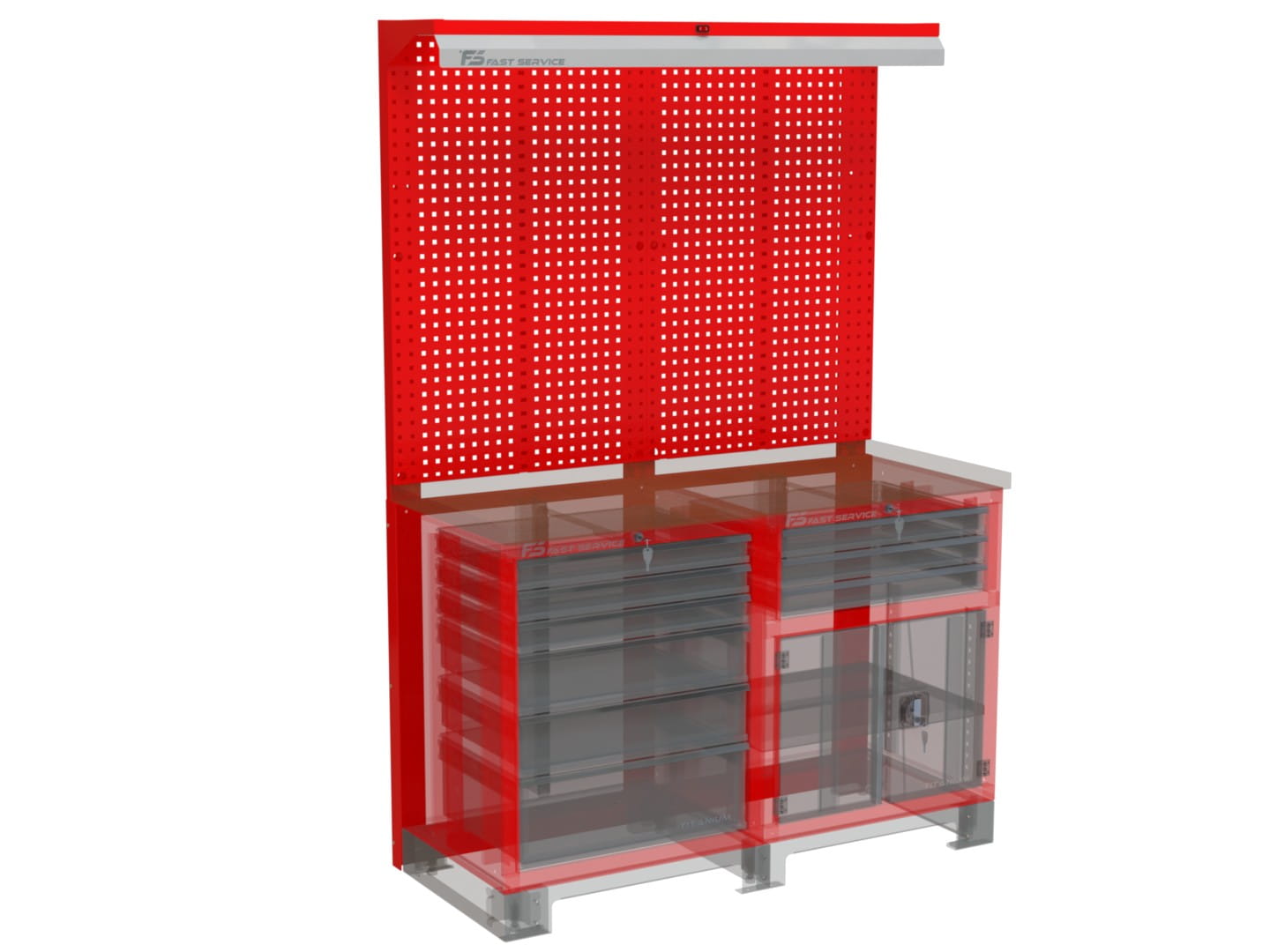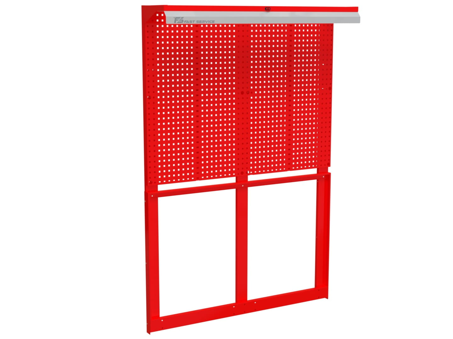 - Płyty perforowane tylnej ściany, wykonane z wysokiej jakości blachy stalowej o grubości 1,0 mm, umożliwiające montaż zawieszek systemowych i narzędzi.