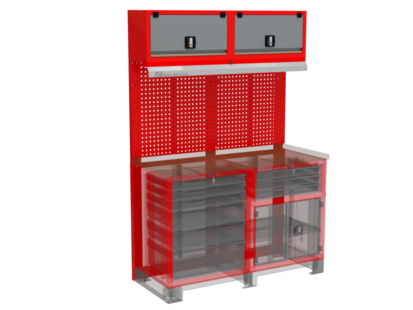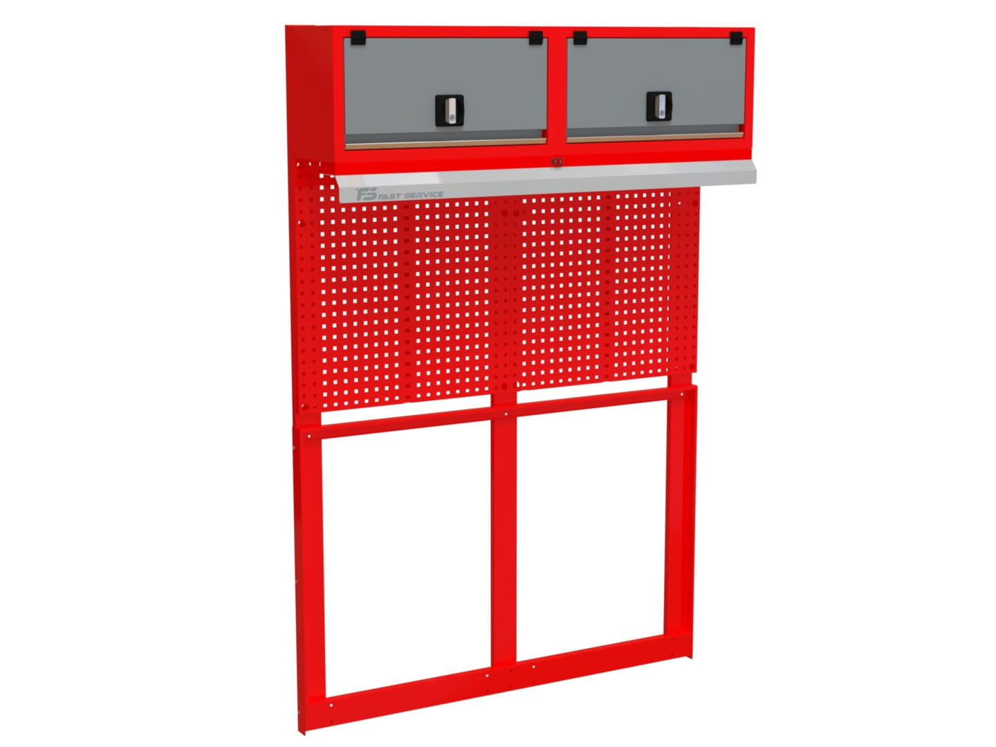 - Perforacja tylnej ściany: oczka 10x10 mm w rozstawie co 32 mm, pozwalające na precyzyjne rozmieszczenie narzędzi.