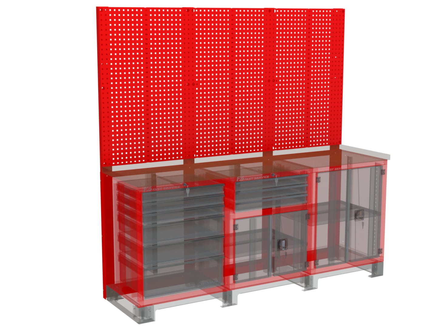 - Perforacja tylnej ściany: oczka 10x10 mm w rozstawie co 32 mm, zapewniające wygodną organizację narzędzi i akcesoriów.