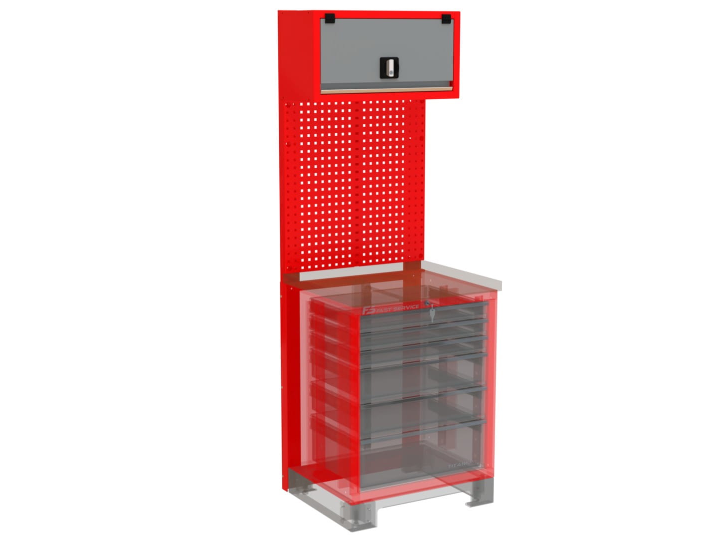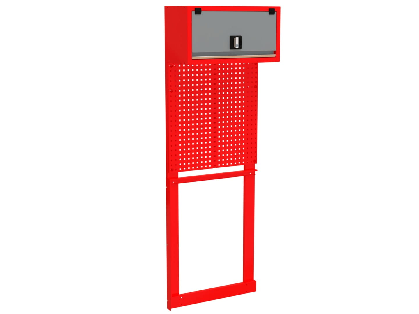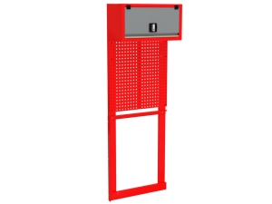 - Płyta perforowana tylnej ściany, wykonana z blachy stalowej o grubości 1,0 mm, pozwalająca na montaż zawieszek systemowych i narzędzi.