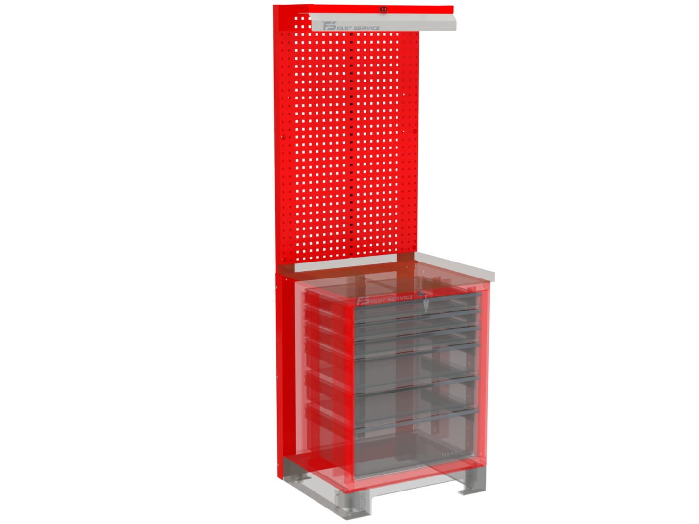 - Perforacja tylnej ściany: oczka 10x10 mm w rozstawie co 32 mm, przystosowana do różnych narzędzi.