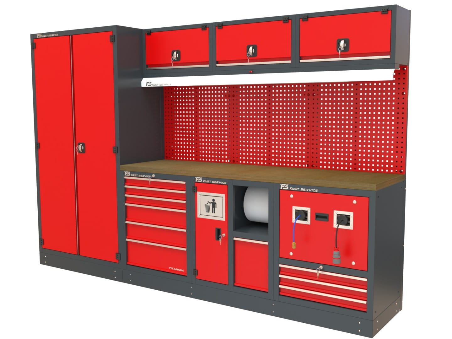 Zaawansowane, profesjonalne stanowisko warsztatowe zaprojektowane z myślą o intensywnej pracy w serwisach, warsztatach montażowych oraz przestrzeniach produkcyjnych. MAXI-5 wyróżnia się zastosowaniem specjalistycznych modułów z uchwytem na papier, koszem oraz zwijaczami powietrza i zasilania 230 V, co zwiększa funkcjonalność całego zestawu i komfort użytkowania.